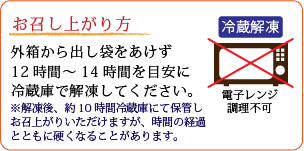 ※解凍方法は「自然解凍」と「冷蔵解凍」2種類です。解凍後の常温下ではお早目にお召し上がりください。